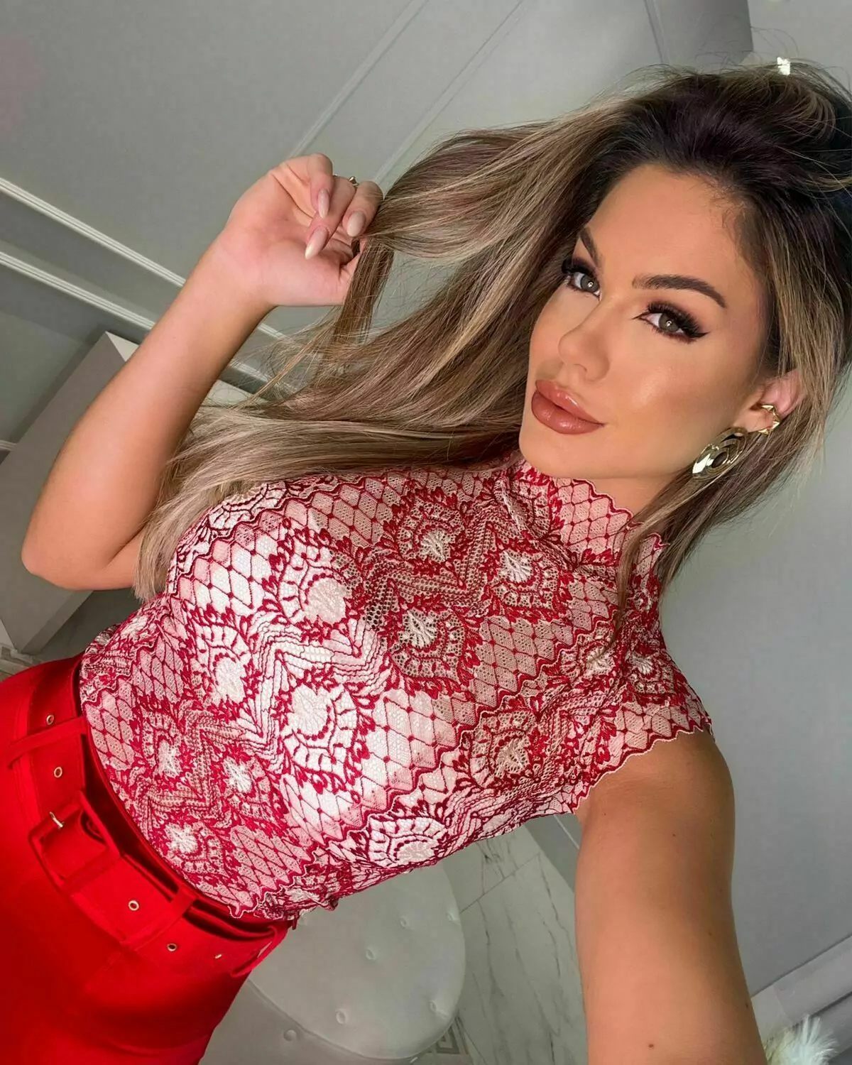 body sem mangas, gola alta, todo em renda com tulê transparente, costas toda fechada, combina detalhes variados para criar um visual de ar contemporâneo e elegante. são o toque final do modelo que, sofisticado e de proporções bem atuais, é indispensável para qualquer closet.