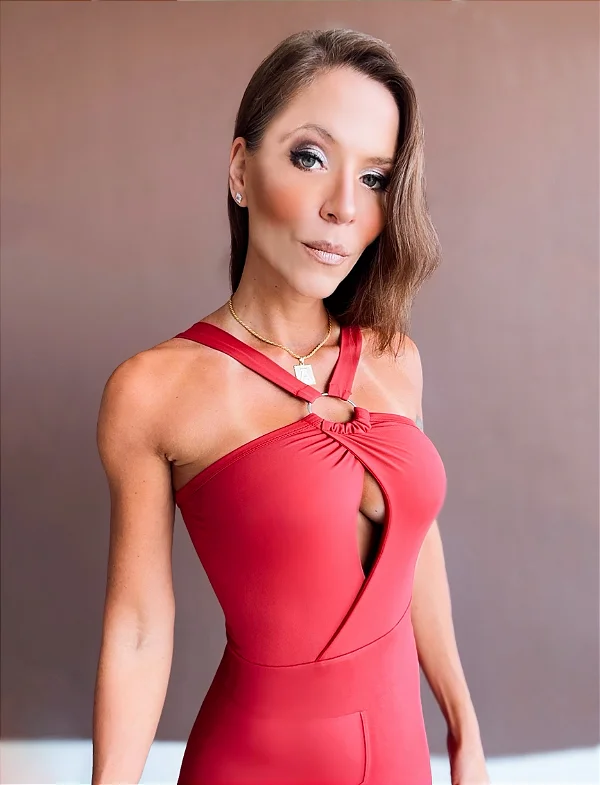 Macacão de alta compressão, tecido poliamida de geamatura grossa, com fenda transpassada no busto e algola; alças que deixam os ombros livres. Zero Transparência