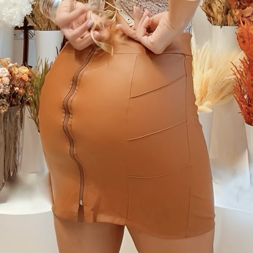 Saia justa, confeccionada em tecido bengaline resinada com acabamento em aspécto visual couro, gramatura light sendo fresquinha no até mesmo no verão; pode ser vestida dos dois lados: face lisa ou face estilizada com camadas e zíper metálico com pingente redondo que dá uma cara super moderna e elegante.