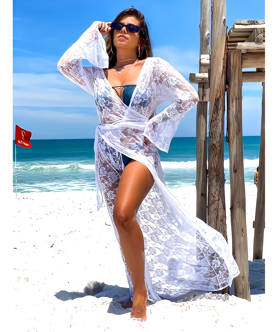 Saída de Praia Kimono em renda, comprimento longo, desenhos em rosas com transparência total e perfurações que permitem a visão do biquine por baixo, conferindo um visual chique e deslumbrante; Fabricação 100% brasileira; padrão de modelagem brasileiro; acompanha faixa para amarração; Mangas com leve abertura;