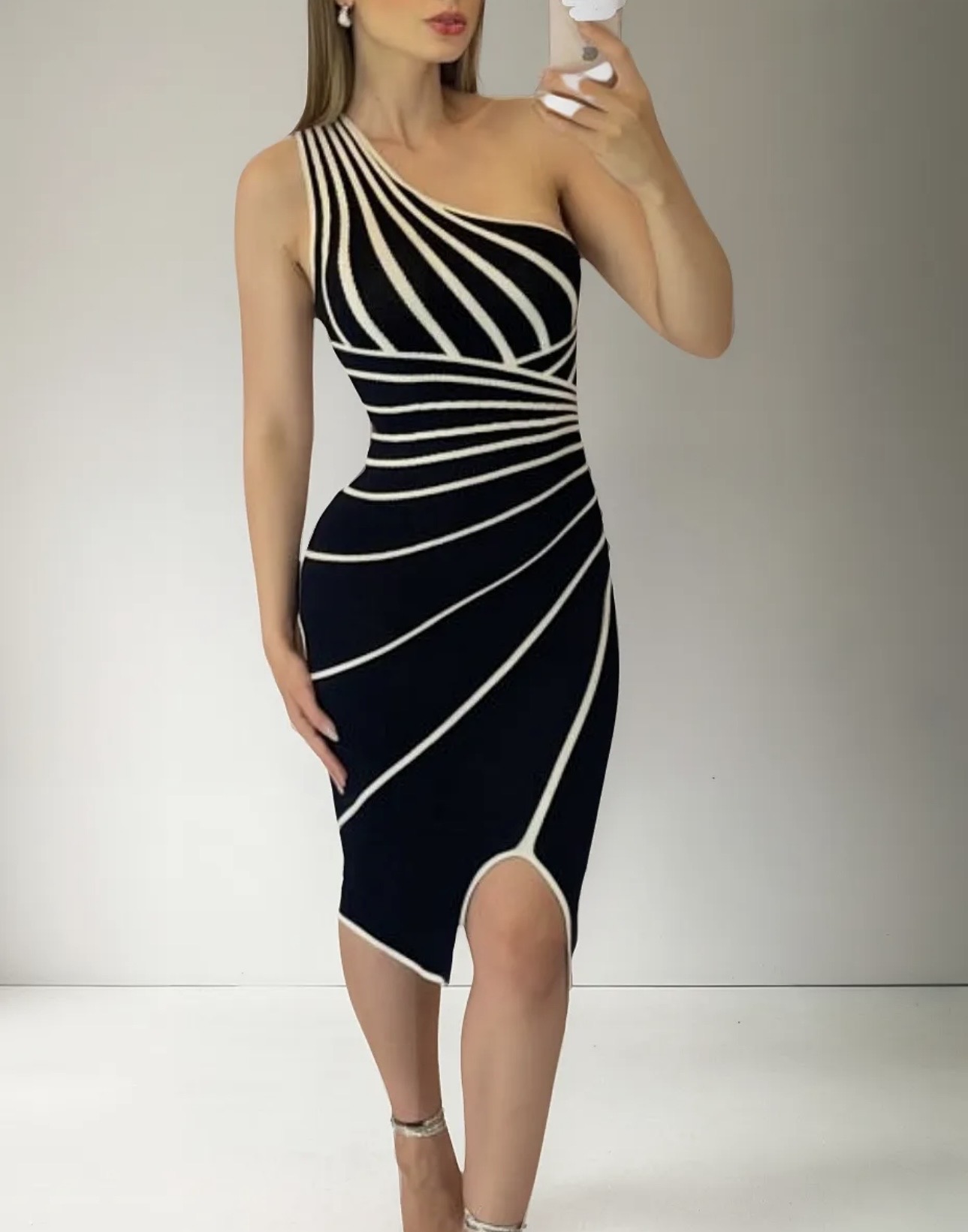 Vestido na altura do joelho com modelagem mais ajustada no corpo em tricot e elastano, com bojo; um ombro só; tecido todo trabalhado com detalhes em linhas que realçam sua modelagem tornando sua silhueta perfeita; Alem de elegante, chique e extremamente sofisticado, é versátil e veste para para qualquer ocasião; tecelagem de gramatura mediana, sendo fresquinho, náo marca e e e zero transparência;