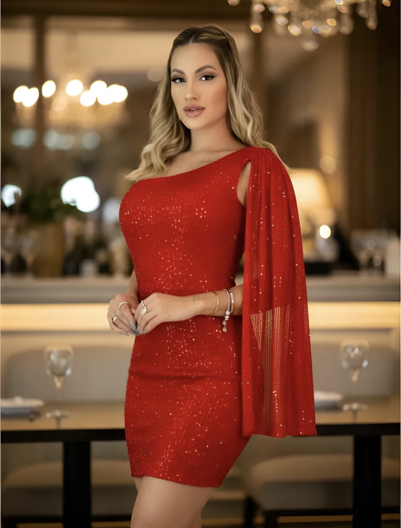 Vestido extremamente elegante e luxuoso, curto com modelagem mais aderente ao corpo em tecido com brilho, marcante, com bojo, não marca, possui forro em suplex inibindo qualquer tipo de transparência; comprimento em meia coxa; manga curta com véu trazendo movimento e elegância em uma das mangas, sendo um ombro só; fecho em zíper;