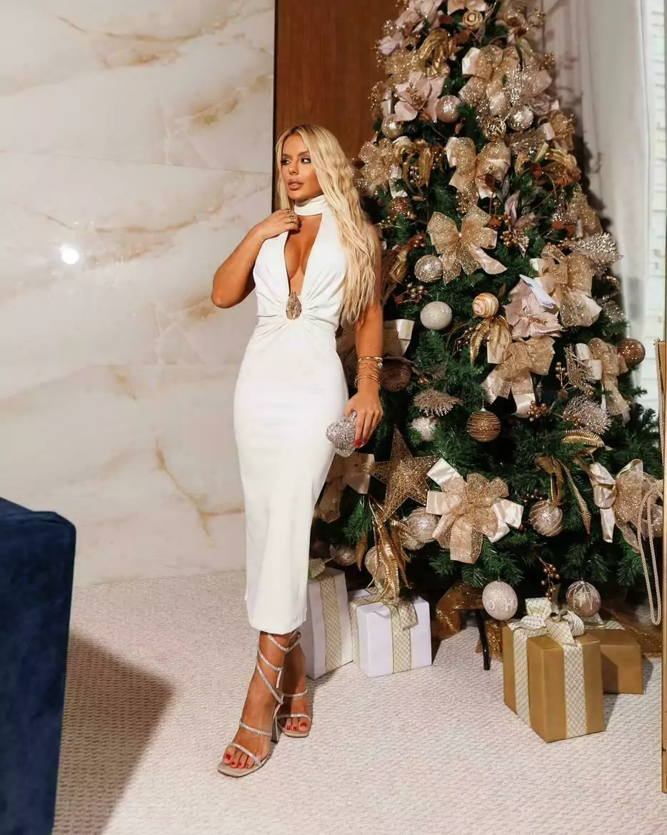Vestido midi alongado, desenha a silhueta sem marcar. Tecido Montaria encorpado; não possui bojo. Zero transparência. Possui decote profundo e ousado, costas nuas com amarração;