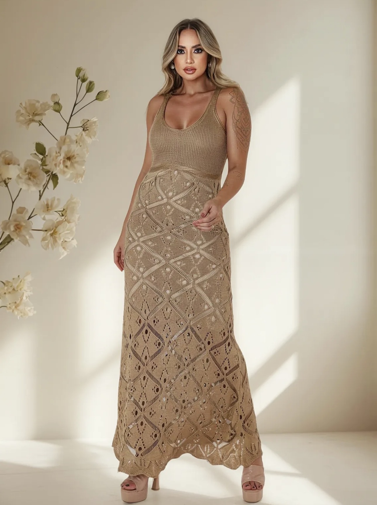 Vestido longo com modelagem mais ajustada no corpo em tricot sem bojo; decote discreto com alças largas e formato em U; trabalho artesanal sofisticado com detalhes elegantes em macramê; ideal para qualquer ocasião; possui forro em suplex inibindo qualquer tipo de transparência; comprimento longo que aumenta a silhueta; modelagem acinturada. Tricot acrílico resinado com leve brilho acetinado sutil, que traz requinte e beleza à peça;